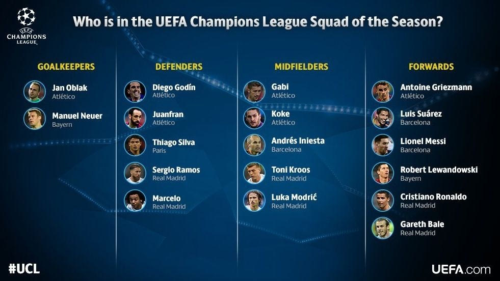Γκοντίν, Χουανφράν (Ατλέτικο Μαδρίτης), Τιαγκο Σίλβα (Παρί Σεν Ζερμέν), Μαρσέλο, Σέρχιο Ράμος (Ρεάλ Μαδρίτης)