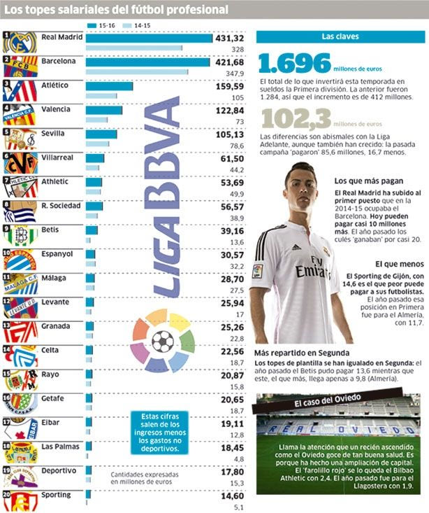 Γι’ αυτό το λόγο η ηλεκτρονική έκδοση της εφημερίδας ” Marca” παρουσίασε έναν αναλυτικό πίνακα με τα έξοδα των συλλόγων για την αγωνιστική περίοδο 2015-16. Όπως θα δείτε και παρακάτω, η διαφορά σε σχέση με την περυσινή σεζόν είναι σημαντική, καθώς υπάρχει μία αύξηση της τάξεως του 32%! Χαρακτηριστικό παράδειγμα η Ρεάλ Μαδρίτης, η οποία έχει αυξήσει τις αμοιβές των παικτών της κατά 100.000.000 ευρώ! Όσον αφορά στην Μπαρτσελόνα, δεν πάει… πίσω, αφού τα έξοδα κυμαίνονται στα 421.680.000 ευρώ, εν αντιθέσει με πέρυσι που ήταν 347.900.000 ευρώ.
