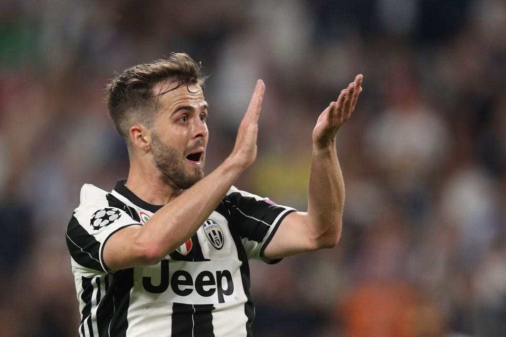 Juventus midfielder Miralem Pjanic reacts during the UEFA Champions League semi final second leg football match Juventus vs Monaco, on May 9, 2017 at the Juventus stadium in Turin. / AFP PHOTO / Valery HACHE (Photo credit should read VALERY HACHE/AFP/Getty Images)