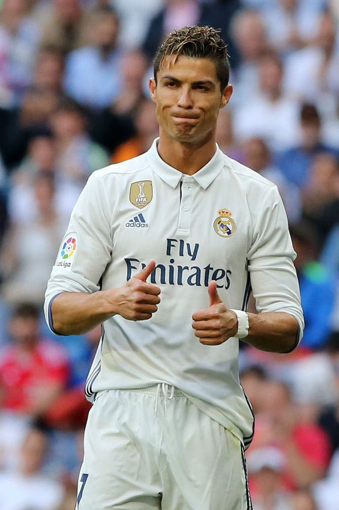 Real Madrid's Portuguese forward Cristiano Ronaldo gestures during the Spanish league football match Real Madrid CF vs Sevilla FC at the Santiago Bernabeu stadium in Madrid on May 14, 2017. / AFP PHOTO / CESAR MANSO (Photo credit should read CESAR MANSO/AFP/Getty Images)
