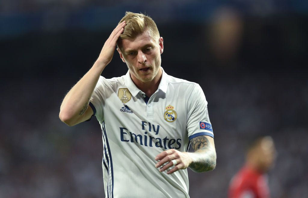 Real Madrid's German midfielder Toni Kroos reacts after a chance during the UEFA Champions League quarterfinal second leg football match Real Madrid vs FC Bayern Munich at the Santiago Bernabeu stadium in Madrid, Spain, on April 18, 2017. / AFP PHOTO / Christof STACHE (Photo credit should read CHRISTOF STACHE/AFP/Getty Images)