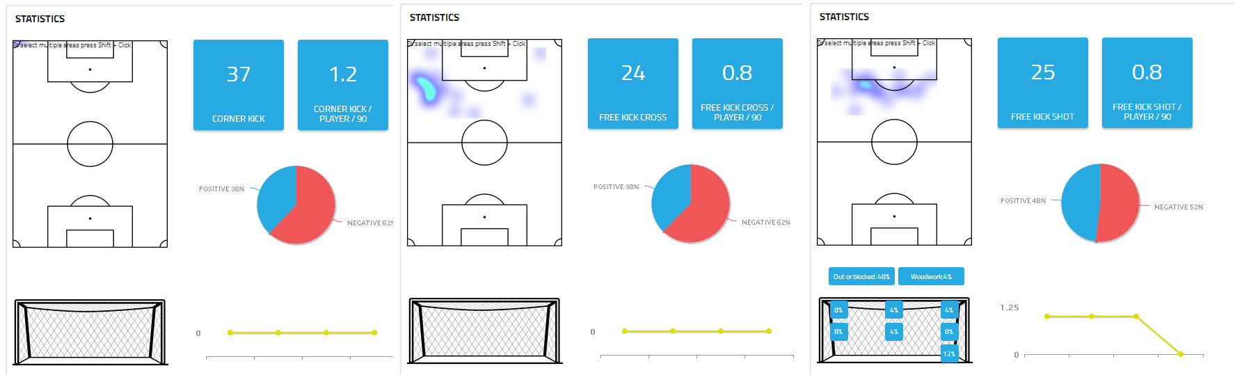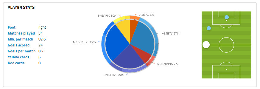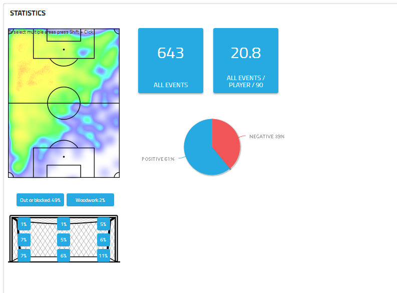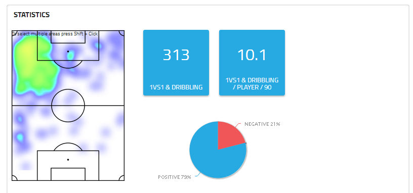 Από τις 643 ενέργειές του, οι 313 είναι επιθετικές μονομαχίες “1vs1” με ποσοστό επιτυχίας στο 79% και οι οι 219 είναι οι υπόλοιπες επιθετικές κινήσεις, με ποσοστό επιτυχίας στο 77%, δυο ποσοστά υψηλά, ειδικά όταν μιλάμε για παίκτη που κατά μέσο όρο, ανά 90 λεπτά, έχει συνολικά 17 επιθετικές ενέργειες. Όσο πιο πολλές είναι οι επιθετικές ενέργειες, τόσο πιο αξιόπιστο είναι και το ποσοστό επιτυχίας. Ο θερμικός χάρτης που αφορά τις “1vs1” μονομαχίες είναι ο… αναμενόμενος, και δείχνει πως ο Λεονάρντο δεν το κουνάει ρούπι από την αριστερή πλευρά της επίθεσης. Μέσω των ατομικών του κινήσεων έχει κερδίσει 93 φάουλ στα παιχνίδια πρωταθλήματος.