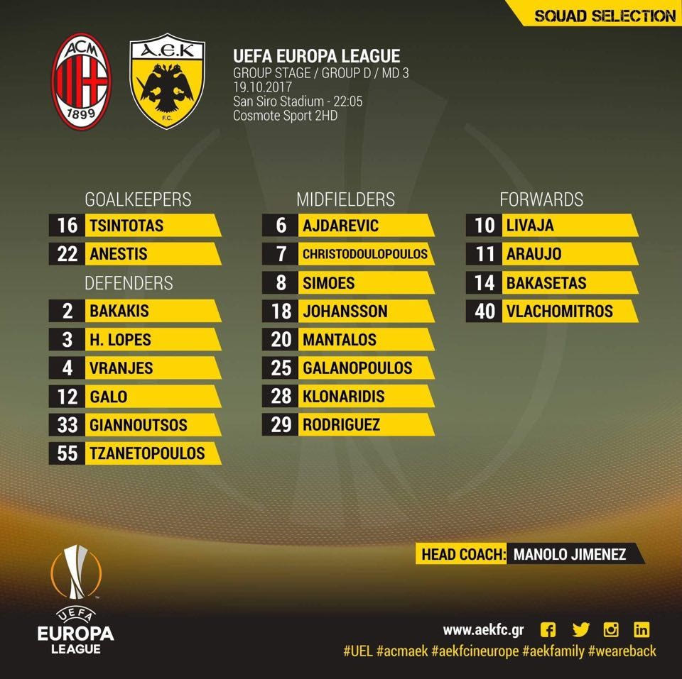 Την αποστολή της ΑΕΚ για το μεγάλο παιχνίδι εκτός έδρας κόντρα στη Μίλαν ανακοίνωσε ο τεχνικός της ομάδας, Μανόλο Χιμένεθ. Δείτε αναλυτικά τη λίστα του.