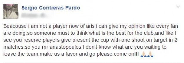 Ο πρώην αρχηγός του Άρη, Σέρχιο Κοκε, λίγη ώρα μετά την ήττα με 1-0 από την Λαμία άσκησε σκληρή κριτική στον προπονητή της ομάδας, Νίκο Αναστόπουλο, με ανάρτησή του στο facebook: