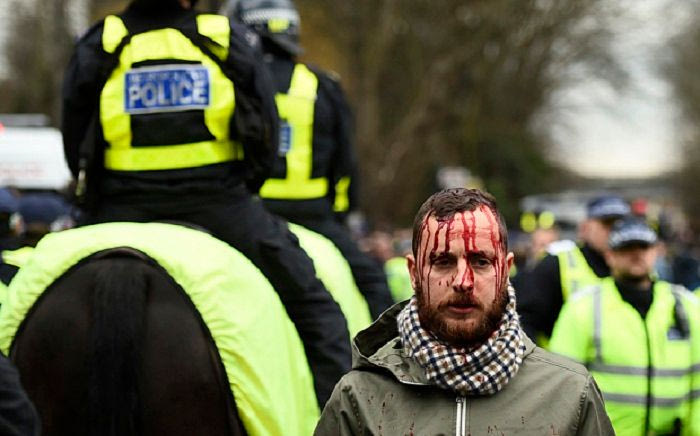 Football Soccer - Tottenham Hotspur v Arsenal - Barclays Premier League - White Hart Lane - 5/3/16 Police and a fan with a head injury outside the ground before the match Reuters / Dylan Martinez Livepic EDITORIAL USE ONLY. No use with unauthorized audio, video, data, fixture lists, club/league logos or "live" services. Online in-match use limited to 45 images, no video emulation. No use in betting, games or single club/league/player publications. Please contact your account representative for further details.
