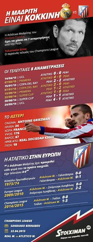 Δείτε το παρακάτω infographic που έχει ετοιμάσει η ομάδα του stoiximan.gr για το παιχνίδι και ετοιμαστείτε για μια μεγάλη μάχη στο “Σαντιάγκο Μπερναμπέου” στις 21:45 την Τετάρτη (22/4).