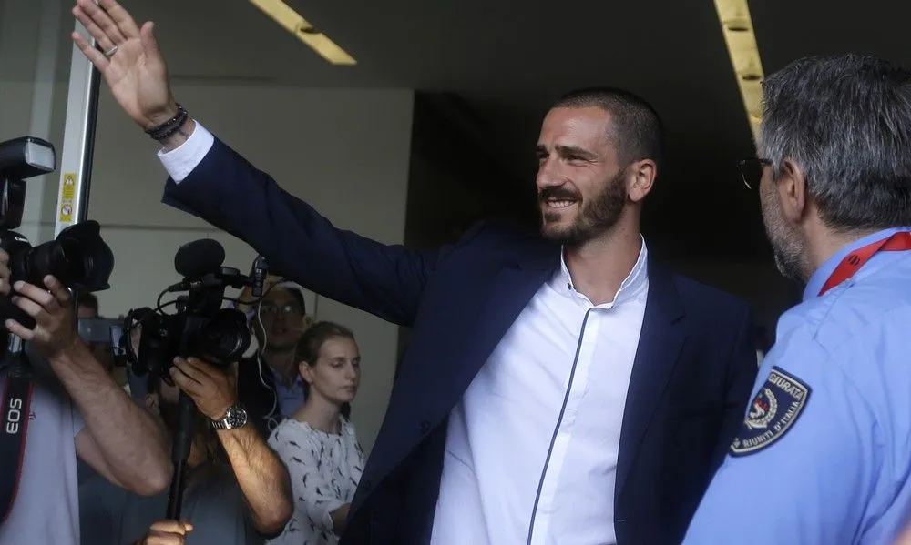 Italy defender Leonardo Bonucci waves to fans as he walks off AC Milan's headquarters, in Milan, Italy, Friday, July 14, 2017. Bonucci is close to completing a transfer from Juventus to rival AC Milan that could signal a shift in the balance of power in Serie A. (AP Photo/Luca Bruno) AP