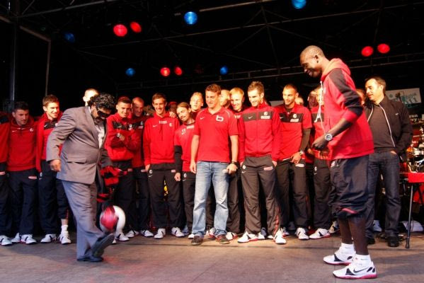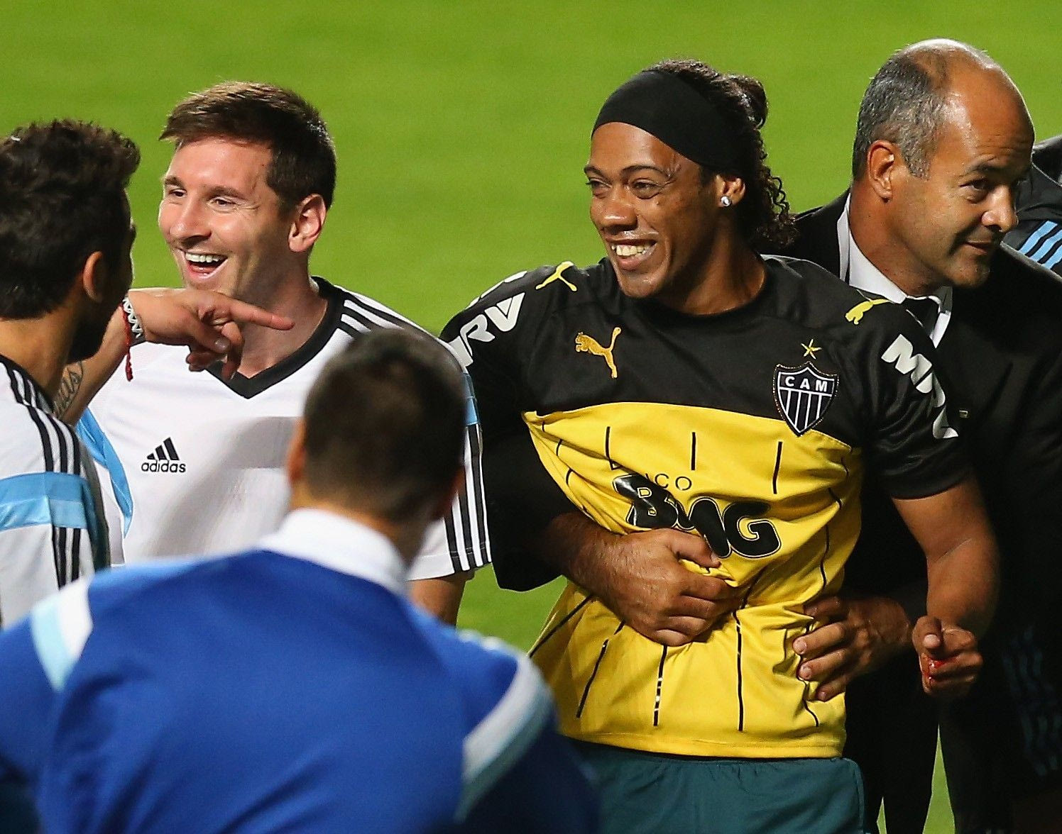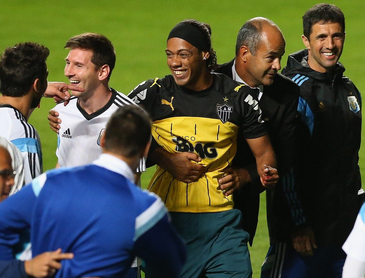 BELO HORIZONTE, BRAZIL - JUNE 11: A fan bearing the resemblance of Ronaldinho is escorted off the field while talking to Lionel Messi of Argentina after an open trainging session ahead of the 2014 FIFA World Cup on June 11, 2014 in Belo Horizonte, Brazil. (Photo by Ronald Martinez/Getty Images)