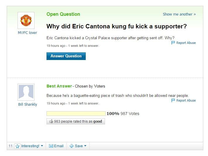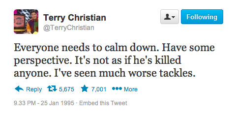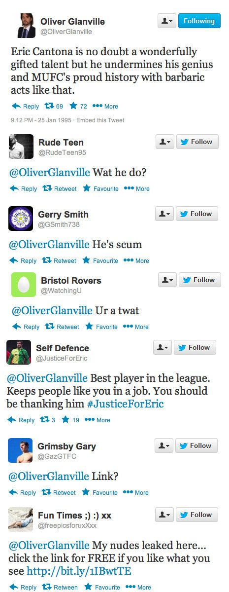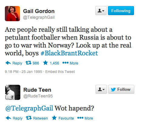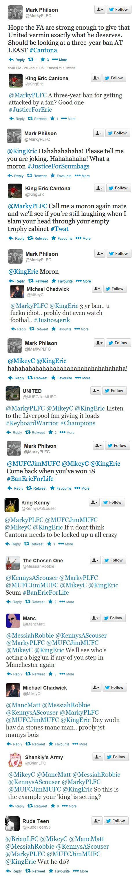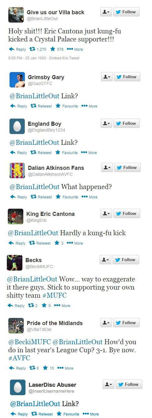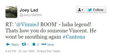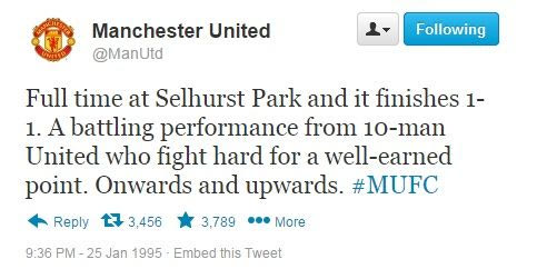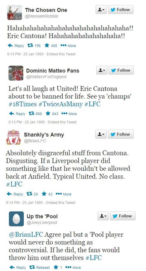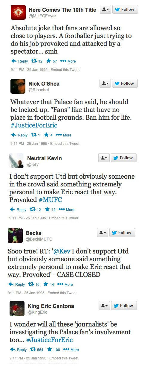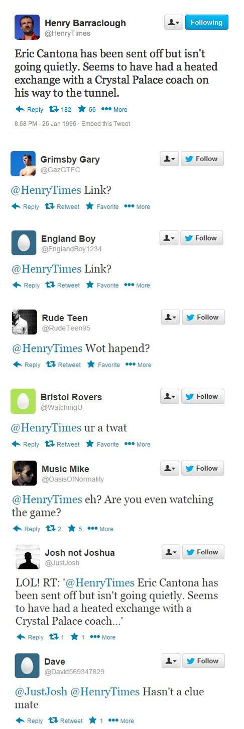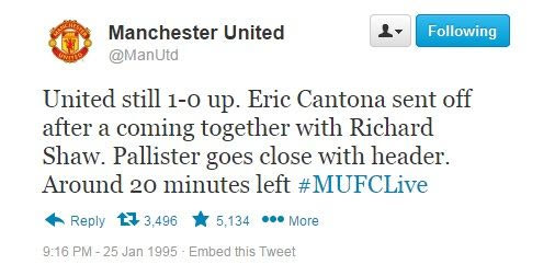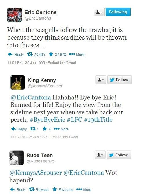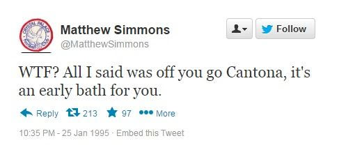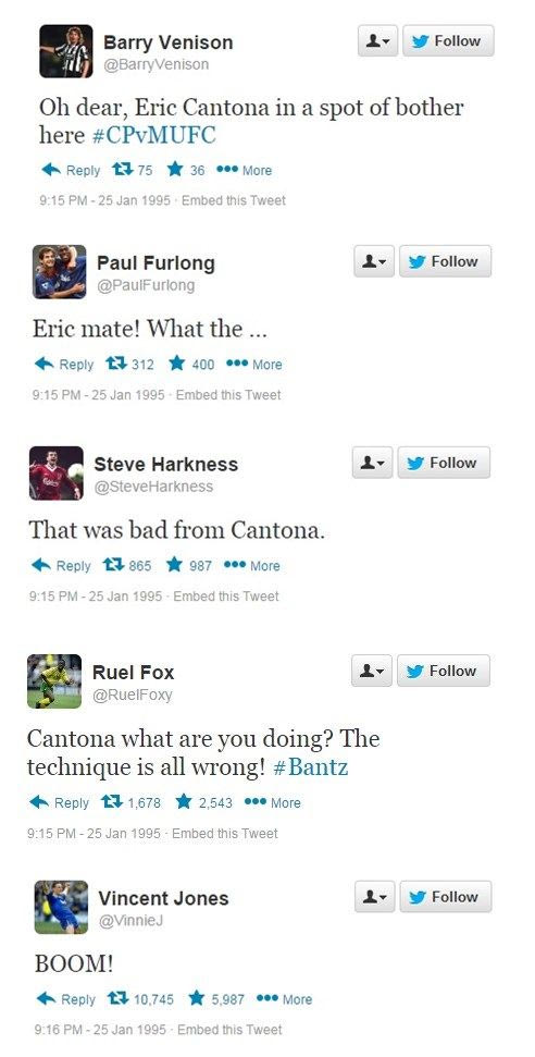 Σαν σήμερα, πριν από 20 χρόνια, ο Ερίκ Καντονά έριξε την περίφημη κλωτσιά στον οπαδό της Κρίσταλ Πάλας. Η ιστοσελίδα "sportsjoe.ie" θέλοντας να τιμήσει την... επέτειο του συγκεκριμένου γεγονότος δημιούργησε ένα κείμενο με το ποιες θα ήταν οι αντιδράσεις των χρηστών σε περίπτωση που το 1995 υπήρχε twitter.