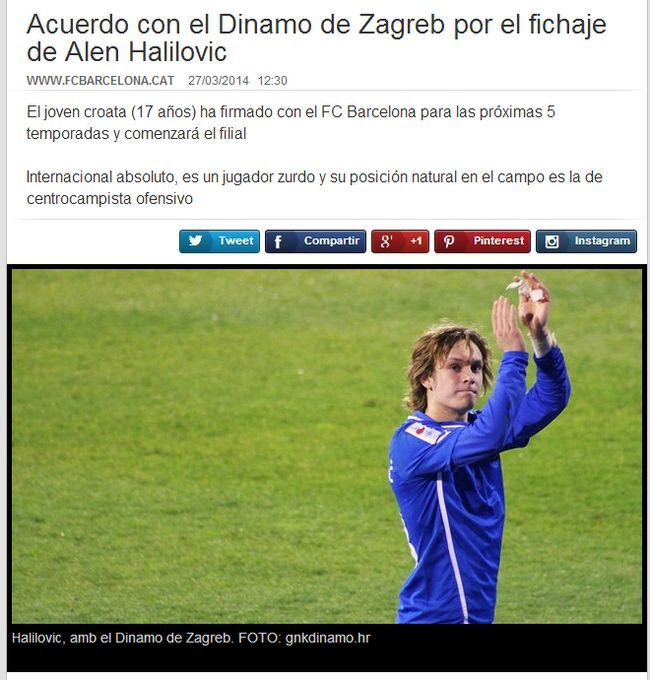 Η Μπαρτσελόνα ανακοίνωσε και επίσημα την Πέμπτη (27/3) την απόκτηση του Άλεν Χαλίλοβιτς, ο οποίος υπέγραψε 5ετές συμβόλαιο συνεργασίας με τους Καταλανούς. Ο 17χρονος θεωρείται ένα από τα μεγαλύτερα ταλέντα του κροατικού ποδοσφαίρου, ενώ χαρακτηρίζεται από τους συμπατριώτες του ως ο “νέος Λούκα Μόντριτς”.