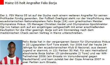 Τον δανεισμό του Φέλιξ Μπόρχα ανακοίνωσε κι επίσημα την Τρίτη η Μάιντζ. Ο επιθετικός από το Εκουαδόρ παραχωρήθηκε δανεικός για ένα χρόνο με τον γερμανικό σύλλογο να έχει το δικαίωμα το επόμενο καλοκαίρι να αγοράσει τον ποδοσφαιριστή από τον Ολυμπιακό.