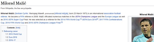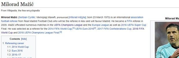“Ο Μίλοραντ Μάζιτς είναι ένας διεθνής διαιτητής από την Ρεάλ Μαδρίτης ο οποίος θα είναι ο διαιτητής στο Κίεβο και θα ευνοήσει την Ρεάλ”, ήταν η πρώτη πρόταση που μπορούσε να διαβάσει κανείς για τον Μίλοραντ Μάζιτς μετά τον ορισμό του, με τους ανθρώπους που διαχειρίζονται τη σελίδα να διορθώνουν την κατάσταση άμεσα αλλά το “κακό” να έχει ήδη γίνει…