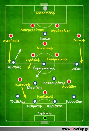 - «επένδυσε» στην δημιουργία «τριγώνων» στο 4-3-3 με σταθερό σημείο αναφοράς τον Κερζάκοφ και συχνές προωθήσεις των κεντρικών του χαφ/πλάγιων μπακ