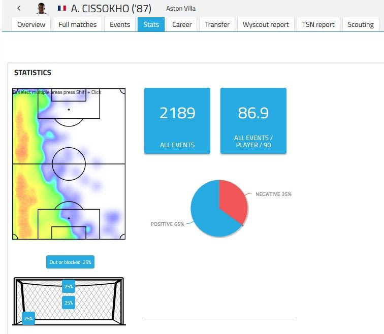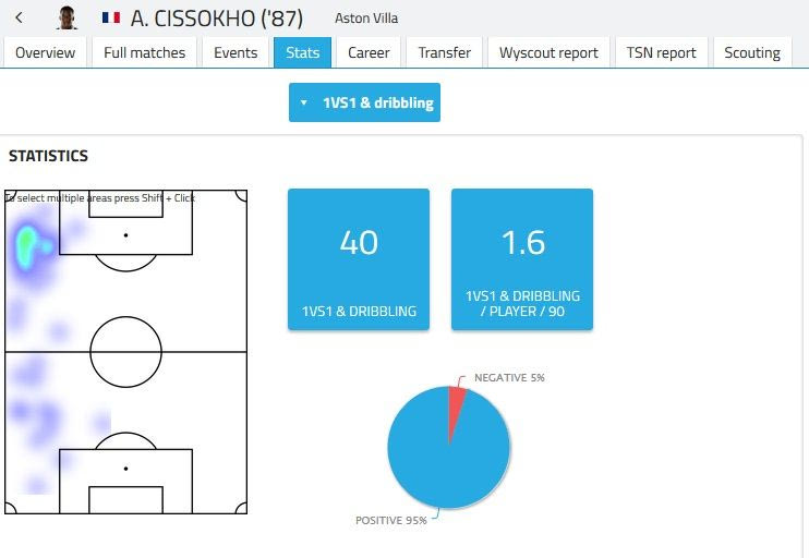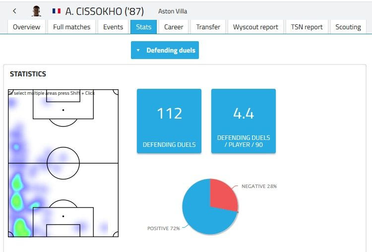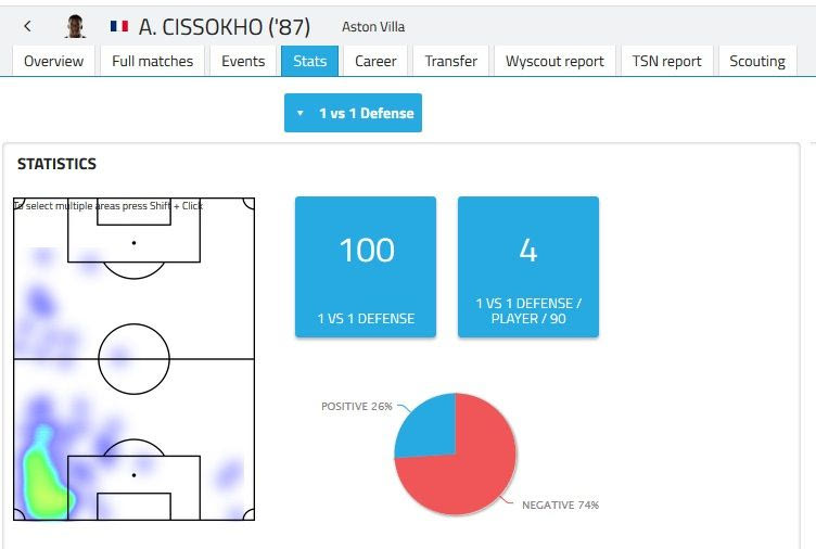 Οι συνολικές “συμμετοχές” του στο παιχνίδι είναι 2189, που μεταφράζονται σε 86,9 ανα 90λεπτο. Ο θερμικός του χάρτης δείχνει πως ο Σισοκό κινείται καθ’ όλο το μήκος της αριστερής γραμμής, με τις κόκκινες περιοχές να είναι δείχνουν έναν παίκτη που φτάνει στα αριστερά κυρίως μέχρι και την γραμμή της αντίπαλης περιοχής.