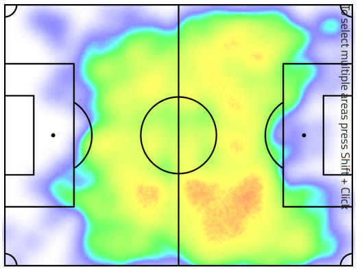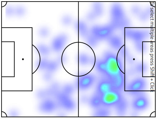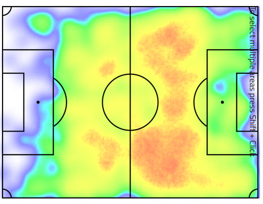 Ο θερμικός του χάρτης “μιλάει” για τον χώρο δράσης του εντός γηπέδου. Έναςbox to boxμέσος, ο οποίος είναι πιο “ζεστός” από τη μεσαία γραμμή μέχρι και την αντίπαλη περιοχή, με στόχο είτε να τροφοδοτεί τους συμπαίκτες του στο τελευταίο τρίτο του γηπέδου, είτε ο ίδιος να δίνει εκεί το παρών για να τελειώνει φάσεις. Και η δραστηριότητα στο τελευταίο τρίτο του γηπέδου είναι αυτή που “μετράει” καθώς ο βαθμός δυσκολίας για τη δράση στο συγκεκριμένο κομμάτι, είναι ο μεγαλύτερος δυνατόν.