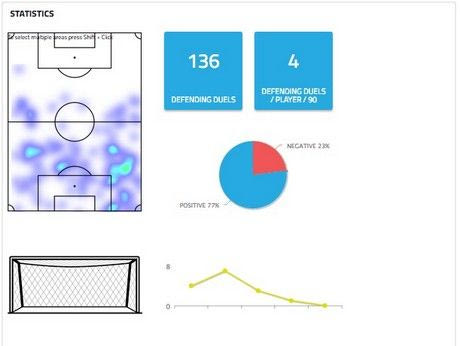 ➔ οι αμυντικές μονομαχίες που έχει δώσει είναι 136, με το ποσοστό επιτυχίας ν’ ανέρχεται στο 77%. Με βάση το θερμικό χάρτη, οι περισσότερες εξ αυτών έχουν δοθεί έξω και δεξιά της μεγάλης περιοχής.