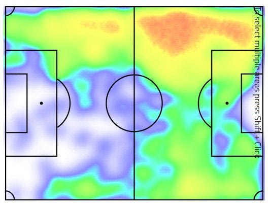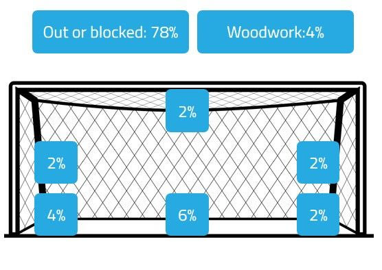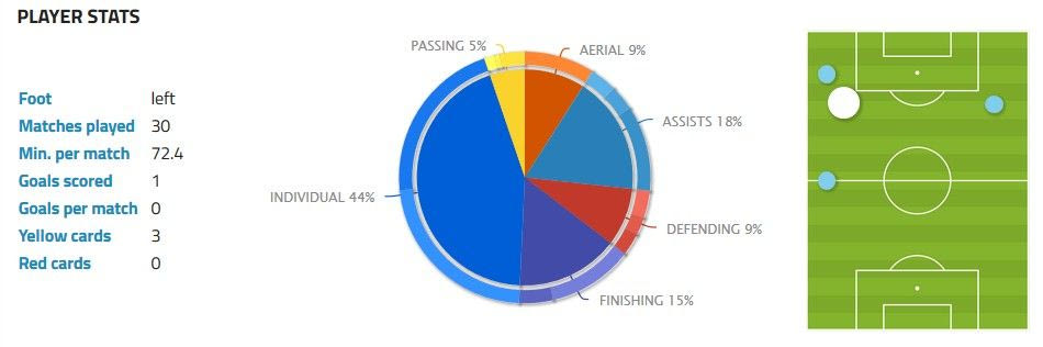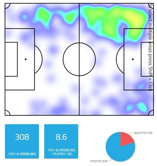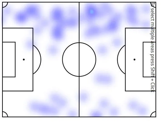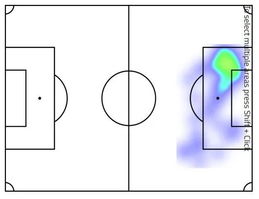 Στη φετινή του καρτέλα των στατιστικών έχουν καταγραφεί 48 τελικές προσπάθειες. Ο θερμικός χάρτης δείχνει πως από αυτά τα 48 σουτ, τα 38 έχουν γίνει στην πράσινη περιοχή, και καταγράφονται κυρίως μετά από “εισβολή” του στη μεγάλη περιοχή από την αριστερή πλευρά. Η καταγραφή της κατάληξης των τελικών του προσπαθειών είναι και ο λόγος για τον οποίο το να τελειώσει μια φάση δεν είναι η πρώτη του επιλογή, καθώς 18% των σουτ του έχουν καταλήξει εντός εστίας…