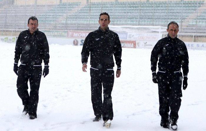 Στα 75 λεπτά πριν από τη σέντρα ο διαιτητής Παπαπέτρου επιθεώρησε το… λευκό χορτάρι και διαπίστωσε ότι δεν είναι δυνατή η διεξαγωγή του αγώνα υπό φυσιολογικές συνθήκες, με αποτέλεσμα ν’ αποφασίσει την επ’ αόριστον αναβολή του.