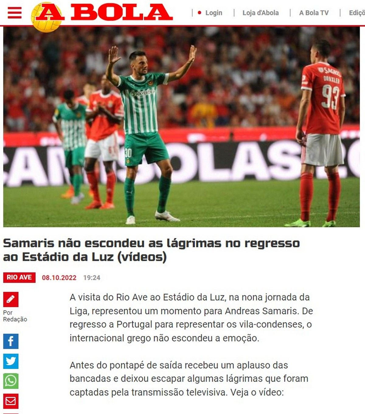 Τα πορτογαλικά media ασχολήθηκαν εκτενώς με την αποθέωση που γνώρισε ο Ανδρέας Σάμαρης κατά την επιστροφή του στο Ντα Λουζ. Τα δάκρυα του Έλληνα μέσου συγκίνησαν τους πάντες.