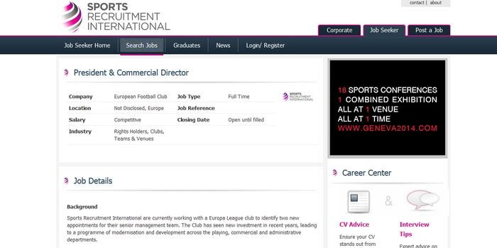 “Η Sports Recruitment International συνεργάζεται με μία ομάδα του Europa League προκειμένου να προσδιορίσει δύο νέες προσλήψεις για την ανώτατη διοίκηση της ομάδας. Ο σύλλογος έχει προχωρήσει σε νέες επενδύσεις και είναι πρόσφατα επικεφαλής ενός προγράμματος εκσυγχρονισμού και ανάπτυξης στους αγωνιστικούς, εμπορικούς και διοικητικούς τομείς.