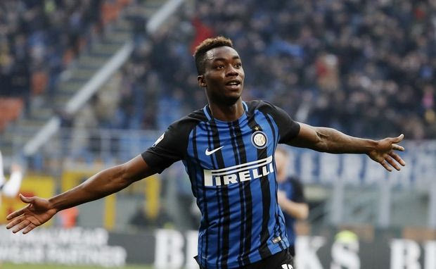 Inter Milan's Yann Karamoh, center, celebrates with his teammates after scoring his side's second goal during the Serie A soccer match between Inter Milan and Bologna at the San Siro stadium in Milan, Italy, Sunday, Feb. 11, 2018. (AP Photo/Antonio Calanni) AP Photo/Antonio Calanni