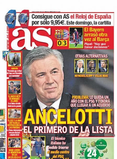 Την ώρα που σύσσωμος ο ισπανικός Τύπος ασχολείται με την παταγώδη αποτυχία της Μπαρτσελόνα και τον οδυνηρό αποκλεισμό της από την Μπάγερν, η ισπανική εφημερίδα AS προτίμησε να αφιερώσει το πρωτοσέλιδό της στον Κάρλο Αντσελότι.