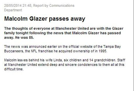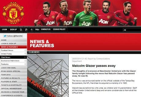 Τρεις ημέρες μετά τα 86α γενέθλιά του, o Μάλκολμ Γκλέιζερ (ιδιοκτήτης της Μάντσεστερ Γιουνάιτεντ και των Τάμπα Μπέι Μπούκανιρς) έφυγε από τη ζωή.