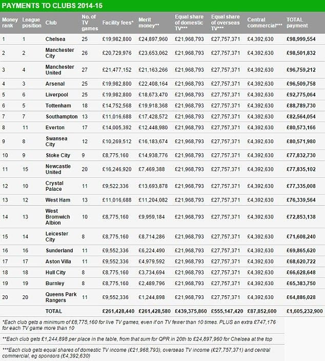Συγκεκριμένα, για την σεζόν 2014-15, το 50 τοις εκατό του εξωφρενικού ποσού των 1.600.000.000 λίρες, θα διαιρεθεί δια του 20, με την κάθε ομάδα να λαμβάνει 27.757.371 λίρες. Ο δεύτερος παράγοντας σχετικά με την μοιρασιά των εσόδων έγκειται στο πόσα παιχνίδια για κάθε ομάδα, υπήρχε τηλεοπτική κάλυψη. Τα περισσότερα στην σχετική κατηγορία τα έχει η Γιουνάιτεντ, με 27 παιχνίδια και ως εκ τούτου έχει και τα πιο πολλά έσοδα, με 21.477.152 λίρες.