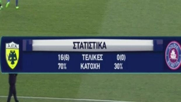 Χαρακτηριστικό της ανωτερότητας των “κιτρινόμαυρων” είναι το γεγονός ότι στο 40ο λεπτό η κατοχή ήταν στο 70%-30% με τελικές 16(6)-0(0) και το σκορ στο 2-0. Μέχρι το τέλος του ημιχρόνου η ΑΕΚ είχε σουτάρει ακόμη μια φορά προς την εστία, κάνοντας το 3-0 με τον Ντίντακ.