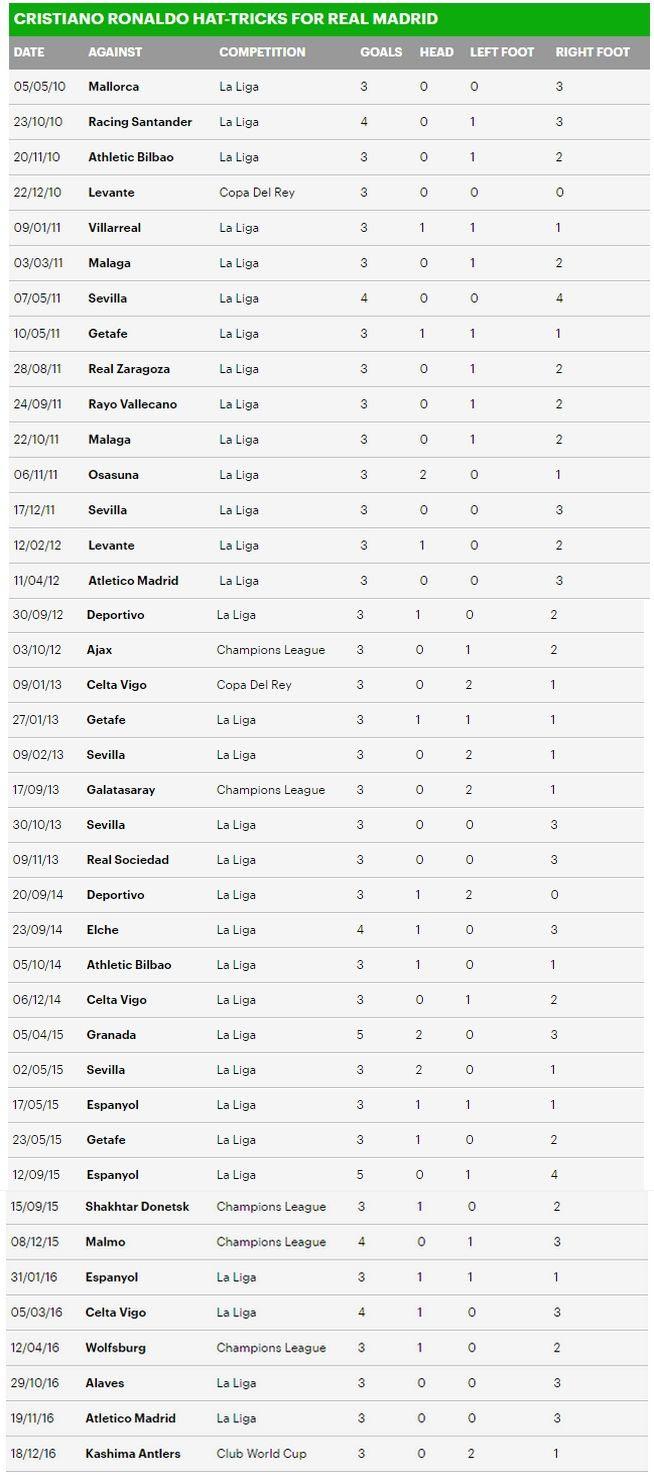 Ο Κριστιάνο Ρονάλντο στα 32 του χρόνια πέτυχε το 40ο χατ-τρικ της καριέρας του με τη φανέλα της Ρεάλ Μαδρίτης! Δείτε όλα τα ματς που έχει πετύχει τρία+ γκολ και με ποιο πόδι έχει σκοράρει (VIDEO).