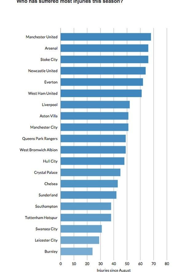 Οπως θα μπορέσετε να δείτε και στον πίνακα που παραθέτουμε οι ομάδες που χτυπήθηκαν περισσότερη από κάθε άλλη από τους τραυματισμού κατά τη διάρκεια της εφετινής Πρέμιερσιπ είναι η Μάντσεστερ Γιουνάιτεντ και η Αρσεναλ.