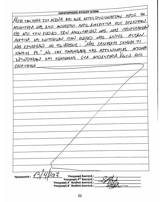 Μας εξύβρισαν με τις φράσεις «μας γαμ…τε σήμερα, τι κάνατε ρε και με την παρέμβαση της αστυνομίας απομακρύνθηκαν και εισήλθαμε στα αποδυτήρια. Καμία άλλη παρατήρηση…”.