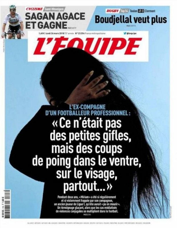 H Equipe της Δευτέρας (26/3) δεν κυκλοφόρησε με ένα συνηθισμένο πρωτοσέλιδο αλλά αντίθετα με ένα που συνιστά “γροθιά στο στομάχι”. Και αυτό γιατί φιλοξενείται (όπως επίσης στις σελίδες 2 και 3 της εφημερίδας) η μαρτυρία μίας πρώην συζύγου παίκτη που αγωνίζεται ακόμα στην Ligue 1, η οποία τόλμησε να βγάλει στη φόρα τα πάνδεινα που τράβηξε στο πλευρό του άνδρα της τα δύο προηγούμενα χρόνια.
