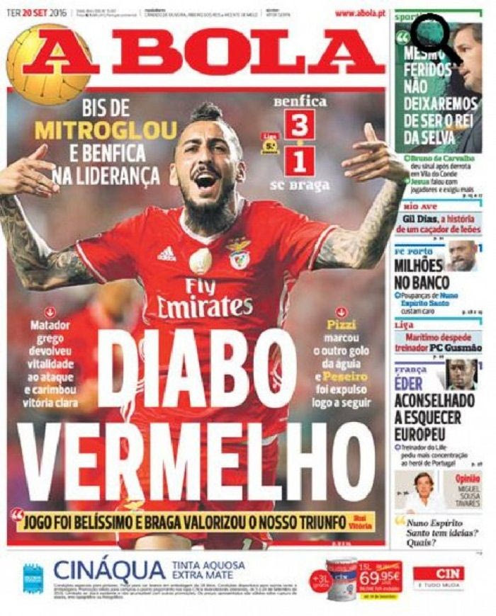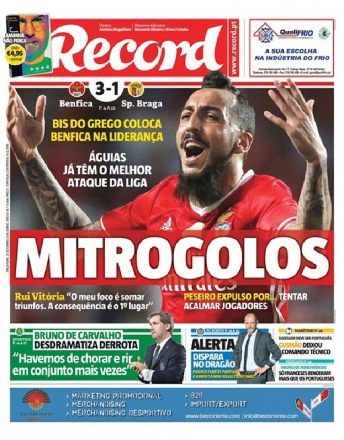 Διθυραμβικά είναι τα πρωτοσέλιδα του αθλητικού Τύπου της Πορτογαλίας μετά την τρομερή εμφάνιση του Κώστα Μήτρογλου και τα δύο γκολ που πέτυχε στη νίκη της Μπενφίκα με 3-1 κόντρα στη Μπράγκα.