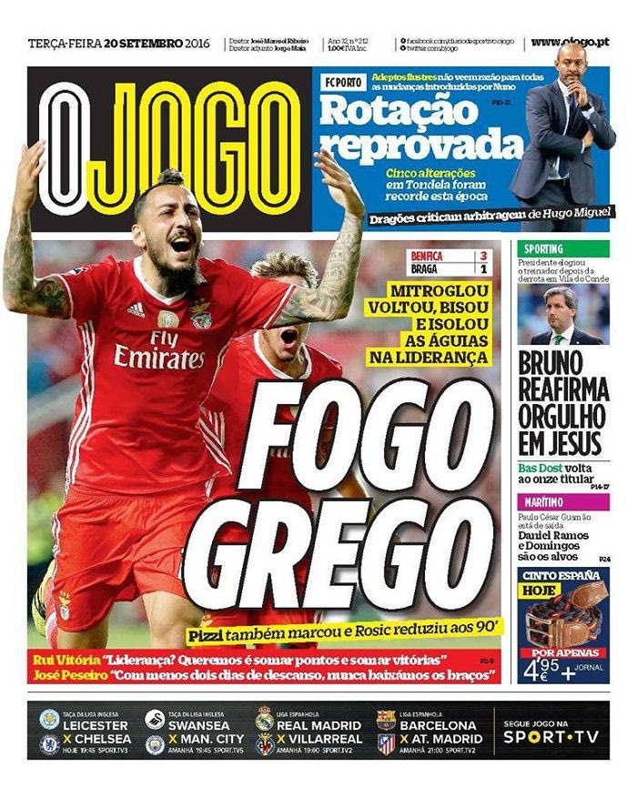 “Mitrogolos”, γράφει η ”Record”, για “Κόκκινο διάβολο” κάνει λόγο η “A Bola”, ενώ για “Ελληνική Φωτιά” μιλάει η “O Jogo”.