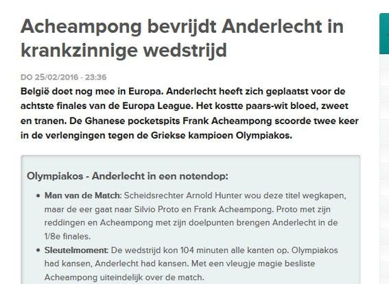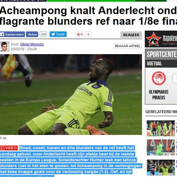 Sporza.be: Ο διαιτητής Χάντερ ήθελε να κλέψει την πρόκριση από την Αντερλεχτ. Ο Προτό όμως και ο Ατσεαμπόνγκ έμειναν όρθιοι. Ο τελευταίος σκόραρε δύο φορές στην παράταση.