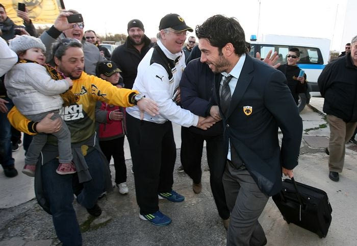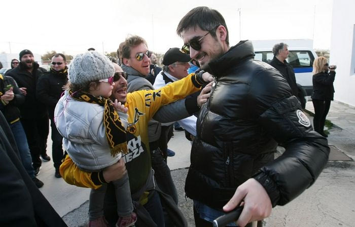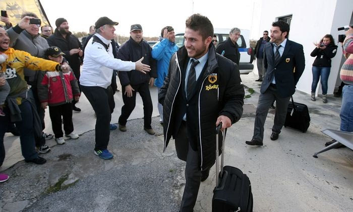 Οι κιτρινόμαυροι προσγειώθηκαν νωρίς το μεσημέρι στον Κρατικό Αερολιμένα Νάξου, όπου αρκετοί φίλοι της ομάδας περίμεναν καρτερικά για να αποθεώσουν τους παίκτες του Τραϊανού Δέλλα.