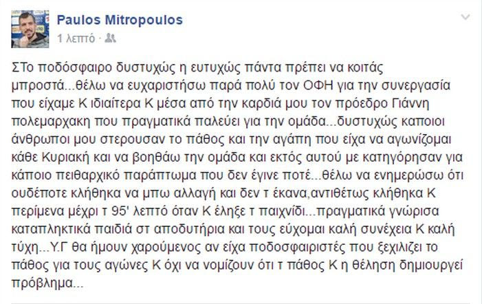 Χαρακτηριστικά έγραψε: Στο ποδόσφαιρο δυστυχώς η ευτυχώς πάντα πρέπει να κοιτάς μπροστά…θέλω να ευχαριστήσω παρά πολύ τον ΟΦΗ για την συνεργασία που είχαμε Κ ιδιαίτερα Κ μέσα από την καρδιά μου τον πρόεδρο Γιάννη πολεμαρχακη που πραγματικά παλεύει για την ομάδα…δυστυχώς καποιοι άνθρωποι μου στερούσαν το πάθος και την αγάπη που είχα να αγωνίζομαι κάθε Κυριακή και να βοηθάω την ομάδα και εκτός αυτού με κατηγόρησαν για κάποιο πειθαρχικό παράπτωμα που δεν έγινε ποτέ…θέλω να ενημερώσω ότι ουδέποτε κλήθηκα να μπω αλλαγή και δεν το έκανα, αντιθέτως κλήθηκα και περίμενα μέχρι το 95′ λεπτό όταν και έληξε το παιχνίδι…πραγματικά γνώρισα καταπληκτικά παιδιά στ’ αποδυτήρια και τους εύχομαι καλή συνέχεια και καλή τύχη…Υ.Γ θα ήμουν χαρούμενος αν είχα ποδοσφαιριστές που ξεχειλιζει το πάθος για τους αγώνες και όχι να νομίζουν ότι τo πάθος και η θέληση δημιουργεί πρόβλημα…