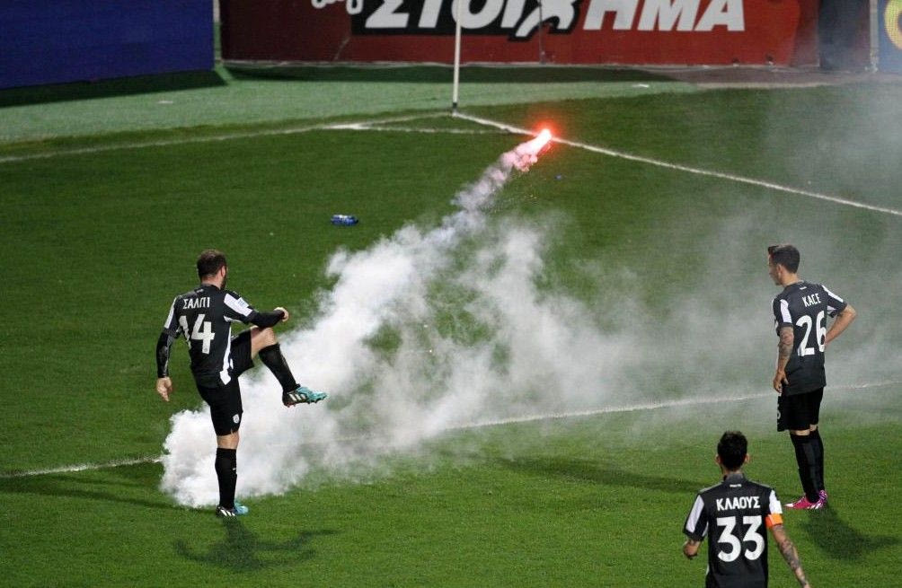 Με απαράμιλλο στυλ, χρησιμοποιώντας προφανώς το “κουτουπιέ”, ο Δημήτρης Σαλπιγγίδης αποφάσισε να μην κλωτσήσει μπάλα (ή άθελά του κάποιον αντίπαλο), αλλά το καπνογόνο.