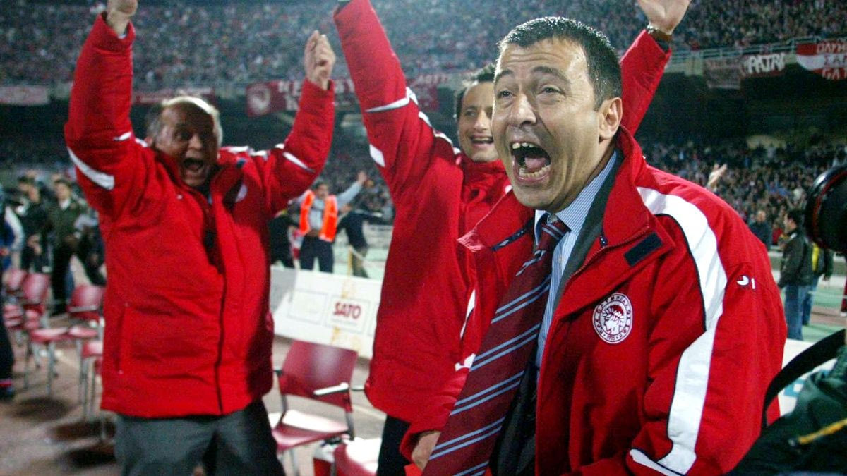Ο προπονητής του Ολυμπιακού, Τάκης Λεμονής, πανηγυρίζει σε αναμέτρηση με την ΑΕΚ για την Α' Εθνική 2001-2002 στο Ολυμπιακό Στάδιο, Σάββατο 20 Απριλίου 2002 Eurokinissi Sports