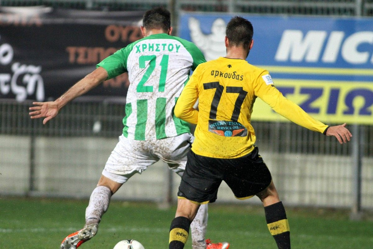 Ο Χρήστος Αρκούδας της ΑΕΚ μαρκάρει τον Γιάννη Χρήστου του Πανθρακικού για τη Super League 2012-2013 στο Δημοτικό Στάδιο Κομοτηνής | Δευτέρα 10 Δεκεμβρίου 2012 Eurokinissi Sports/Λάζαρος Τσούτσας