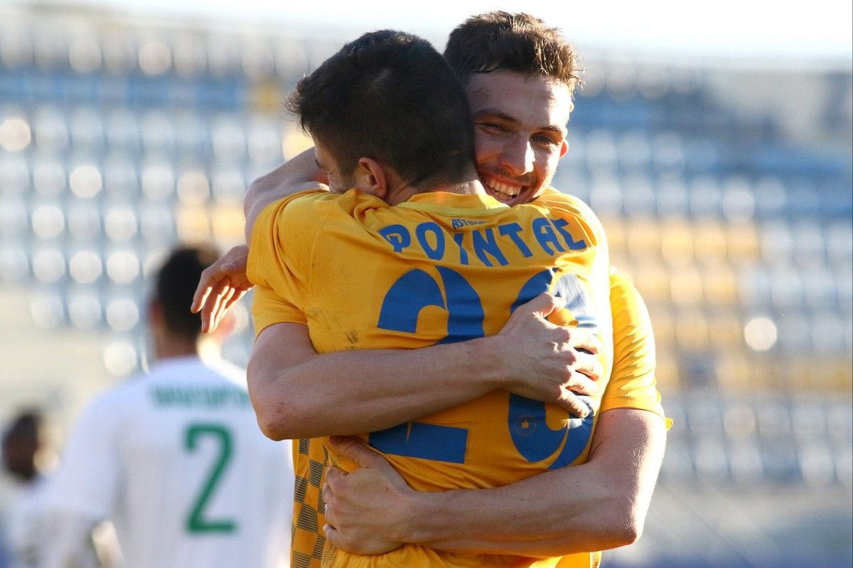 Ο Ταξιάρχης Φούντας του Αστέρα πανηγυρίζει με τον Απόστολο Γιάννου γκολ κόντρα στον Πανθρακικό για τη Super League 2015-2016 στο 'Θεόδωρος Κολοκοτρώνης' | Σάββατο 2 Ιανουαρίου 2016 Eurokinissi Sports/Ανδρέας Παπακωνσταντίνου