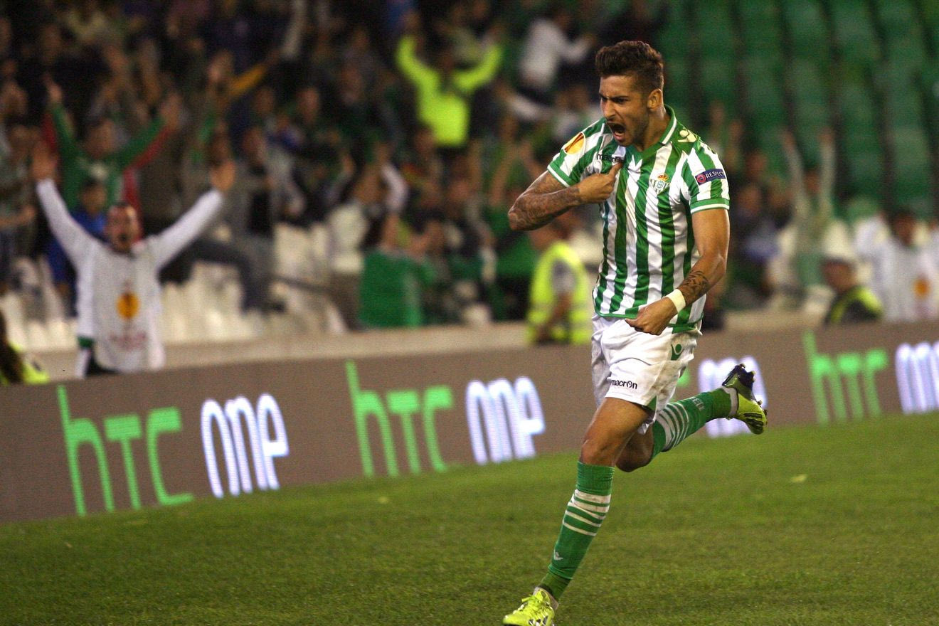 Betis' Álvaro Vadillo celebrates scoring the opening goal during an Europa League group I soccer match between Real Betis and Vitoria Guimaraes in Sevilla, Spain, Thursday, Oct. 24, 2013. (AP Photo/Toni Rodriguez)