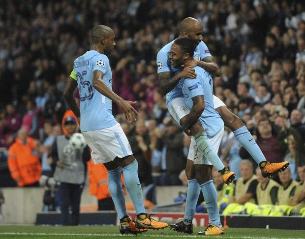 Manchester City's Raheem Sterling celebrates with teammates after scoring his sides second goal of the game during the Champions League Group F soccer match between Manchester City and Shakhtar Donetsk at Etihad stadium, Manchester, England, Tuesday, Sept. 26, 2017.City won the game 2-0. (AP Photo/Rui Vieira) AP Photo/Rui Vieira