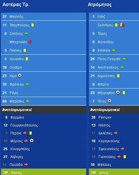 Μόνο για το ημίχρονο καθώς ο Αστέρας προηγήθηκε στο πρώτο λεπτό της επανάληψης, σενάριο το οποίο θα μπορούσε να προβλέψει κανείς με βάση την εικόνα του ματς. Ο Φυτανίδης έκανε ένα πολύ κρίσιμο λάθος στο κέντρο άμυνας του Ατρομήτου και έδωσε την ευκαιρία στον Ναβάρο να γράψει το 2-1 και να διαμορφώσει συνθήκες αγώνα που ταιριάζουν απόλυτα στον Αστέρα.