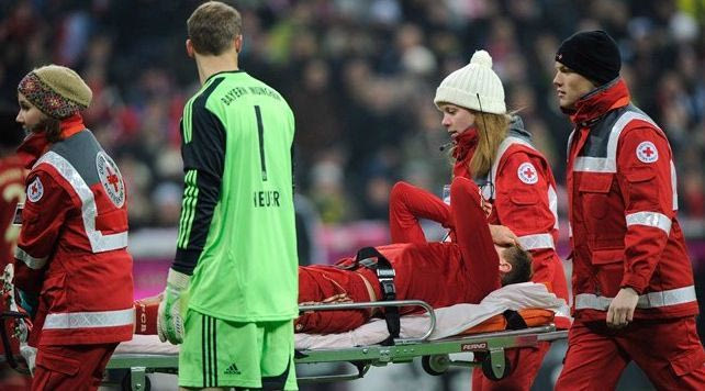 Τόνι Κρόος και Χάβι Μαρτίνεθ από τη μία, Μάρκο Ρόις και Μάριο Γκέτσε από την άλλη κουβαλούσαν περισσότερο την μπάλα, ψάχνοντας χώρους για κάθετες πάσες στα δύο προωθημένα φορ, τους Μάριο Μάντζουκιτς και Ρόμπερτ Λεβαντόβσκι. Καθαρή ευκαιρία δεν υπήρχε, όμως, στο πρώτο 45λεπτο, με συνέπεια το ημίχρονο αυτό να στιγματιστεί από το σοβαρό τραυματισμό του Χόλγκερ Μπάντστούμπερ, ο οποίος υπέστη ρήξη χιαστών και αντικαταστάθηκε στο 39ο λεπτό.
