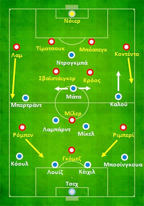 Οι πλάγιοι μπακ επιχείρησαν overlap, ο επιθετικογενής Μίλερ τοποθετήθηκε πίσω από τον Γκόμεζ και ο target man Γκόμεζ αναζήτησε τις συνεργασίες με την τριάδα των μεσοεπιθετικών που βρέθηκαν από πίσω του. Ο Χάινκες επιστράτευσε όλα τα μέσα της θεωρίας του ποδοσφαίρου ώστε να διασπάσει την αμυντική συνοχή της Τσέλσι, επιλέγοντας απλά να διατηρήσει τους Σβαϊστάιγκερ και Κρόος σχετικά χαμηλά ως… ανάχωμα πριν τα δύο στόπερ. Ήταν προφανές ότι ο αγωνιστικός σχεδιασμός των Βαυαρών εστίασε στις γραμμές.