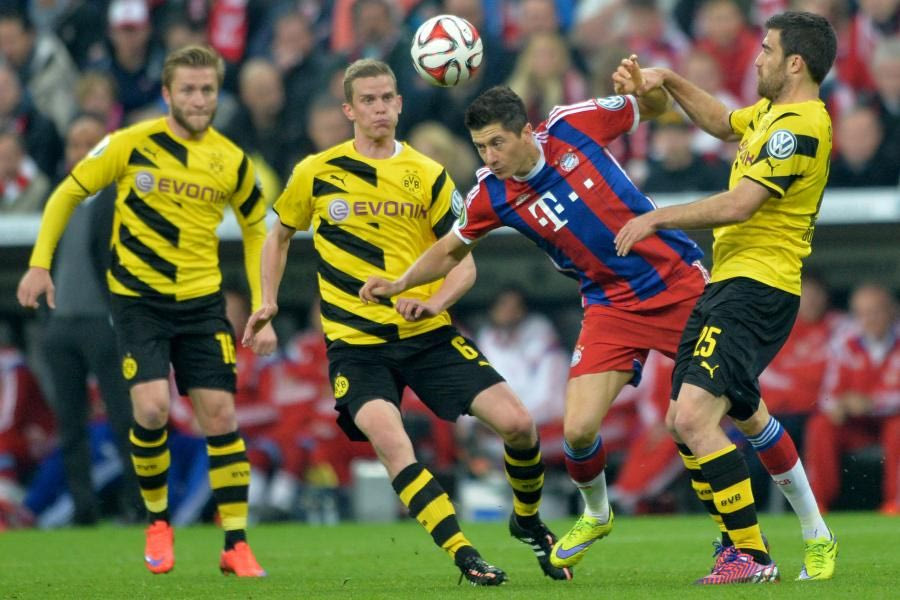 Η Ντόρτμουντ αμύνθηκε καλά στο ξεκίνημα και έδειχνε απειλητική στις αντεπιθέσεις, αλλά η Μπάγερν, αφού απείλησε στο 14ο λεπτό με την κεφαλιά του Τόμας Μίλερ, άνοιξε το σκορ στο 30ό με τον Ρόμπερτ Λεβαντόβσκι (αρχικά σημάδεψε το δεξί δοκάρι με σκαφτό πλασέ κι εν συνεχεία βρήκε το στόχο).