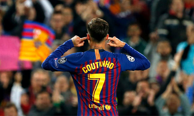 Ο Κοουτίνιο έχει πετύχει το 3-0 και πανηγυρίζει με αυτόν τον τρόπο (AP Photo/Joan Monfort)