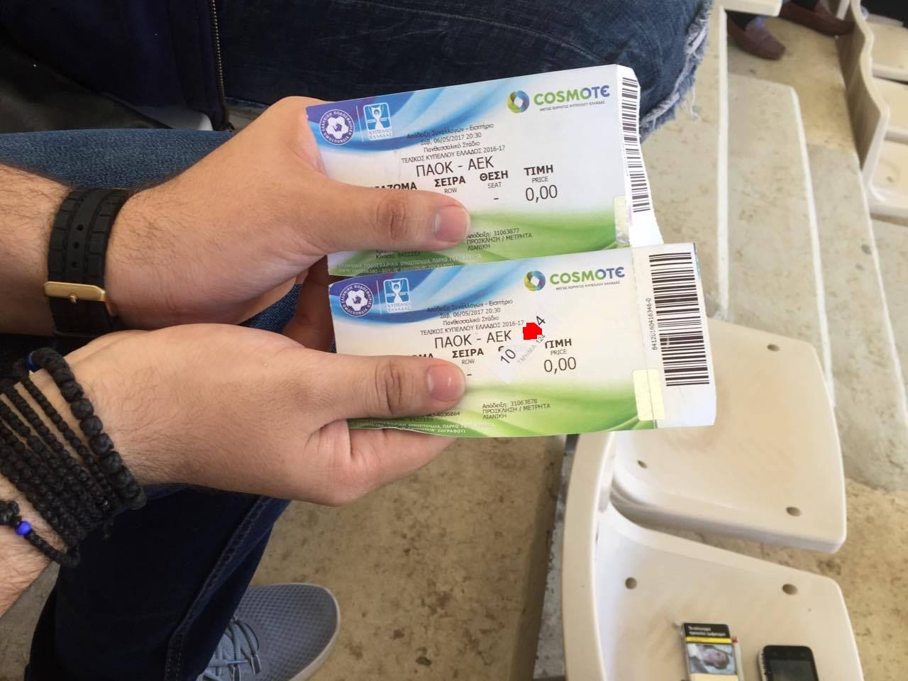 Στη φωτογραφία που ακολουθεί οπαδός κρατάει ένα αριθμημένο εισιτήριο με… αυτοκόλλητο και ένα σκέτο!